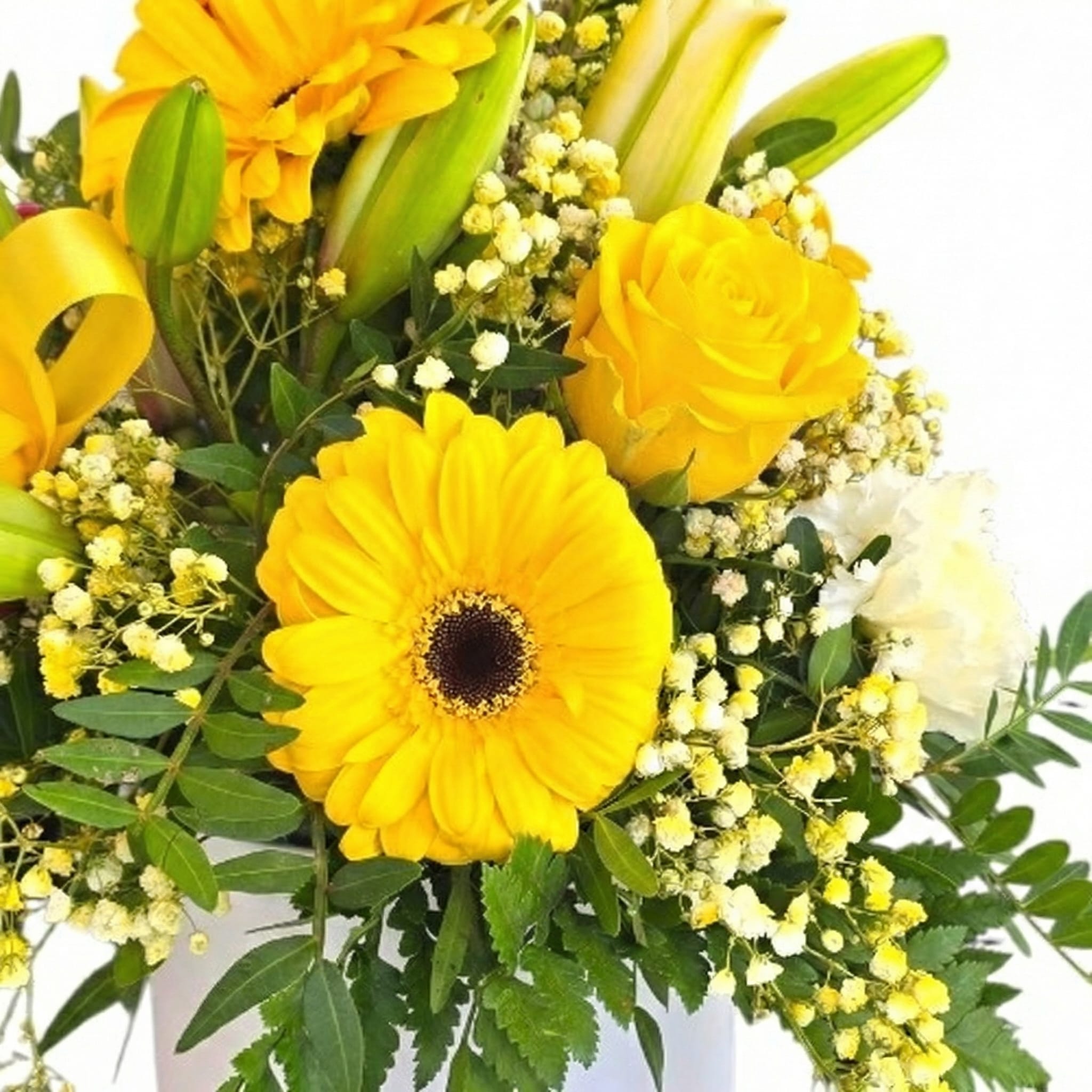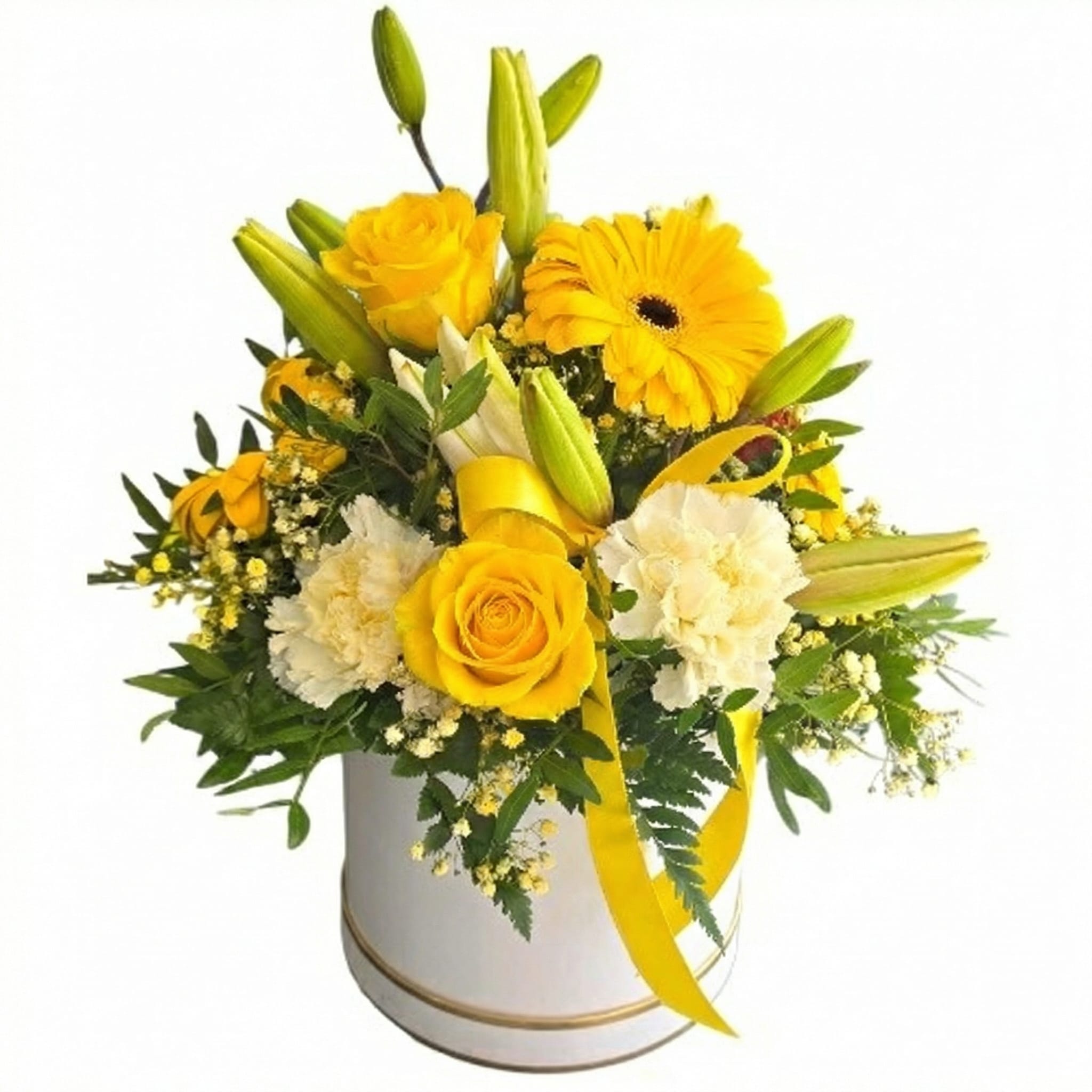 A bright, cheerful arrangement featuring yellow roses, gerberas, and fresh whites, accented with delicate greenery. Nestled in a elegant white hat box with a yellow ribbon—perfect for celebrations, gifting, or brightening someone’s day.