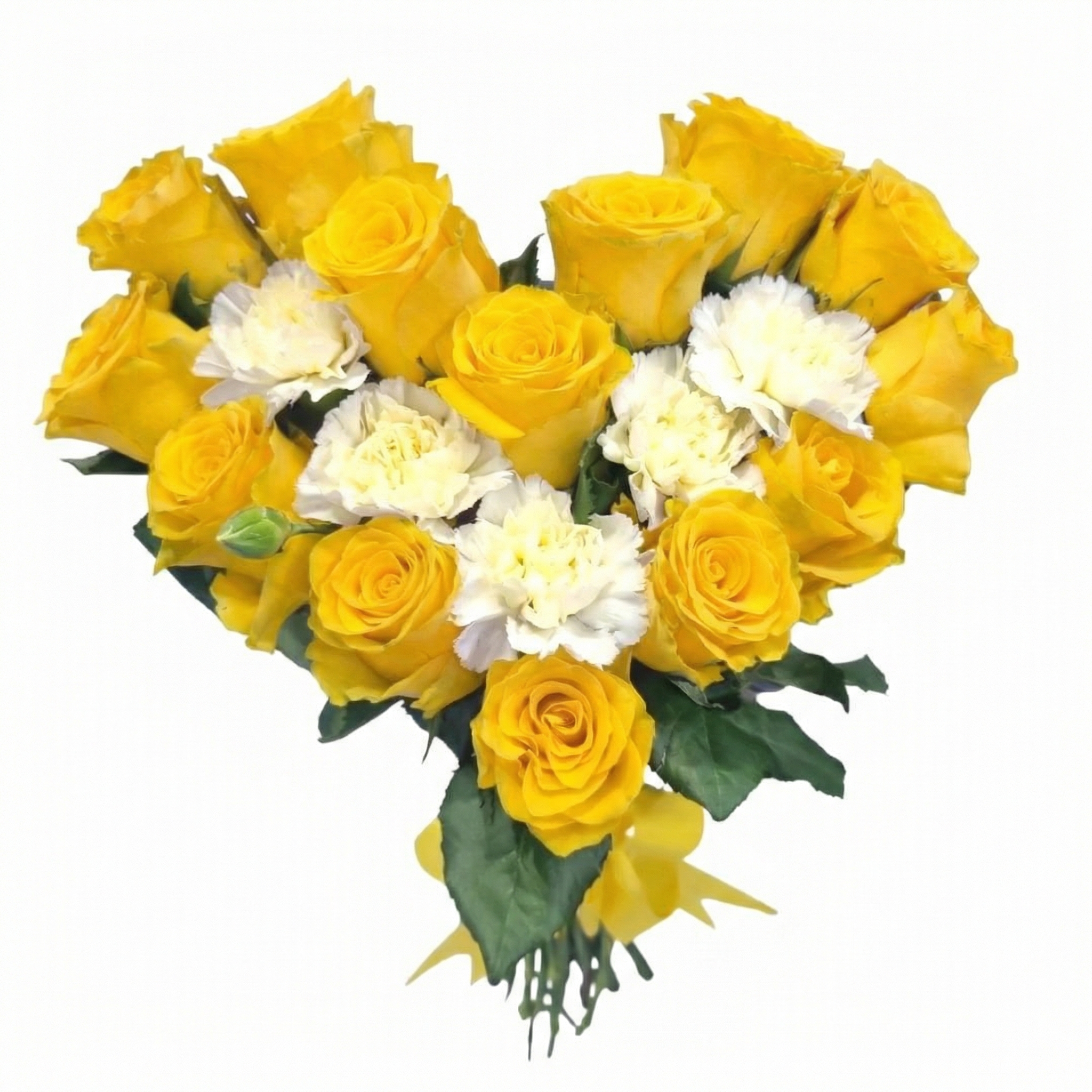 A heart-shaped bouquet featuring bright yellow roses and delicate white carnations, artfully arranged with lush green foliage.