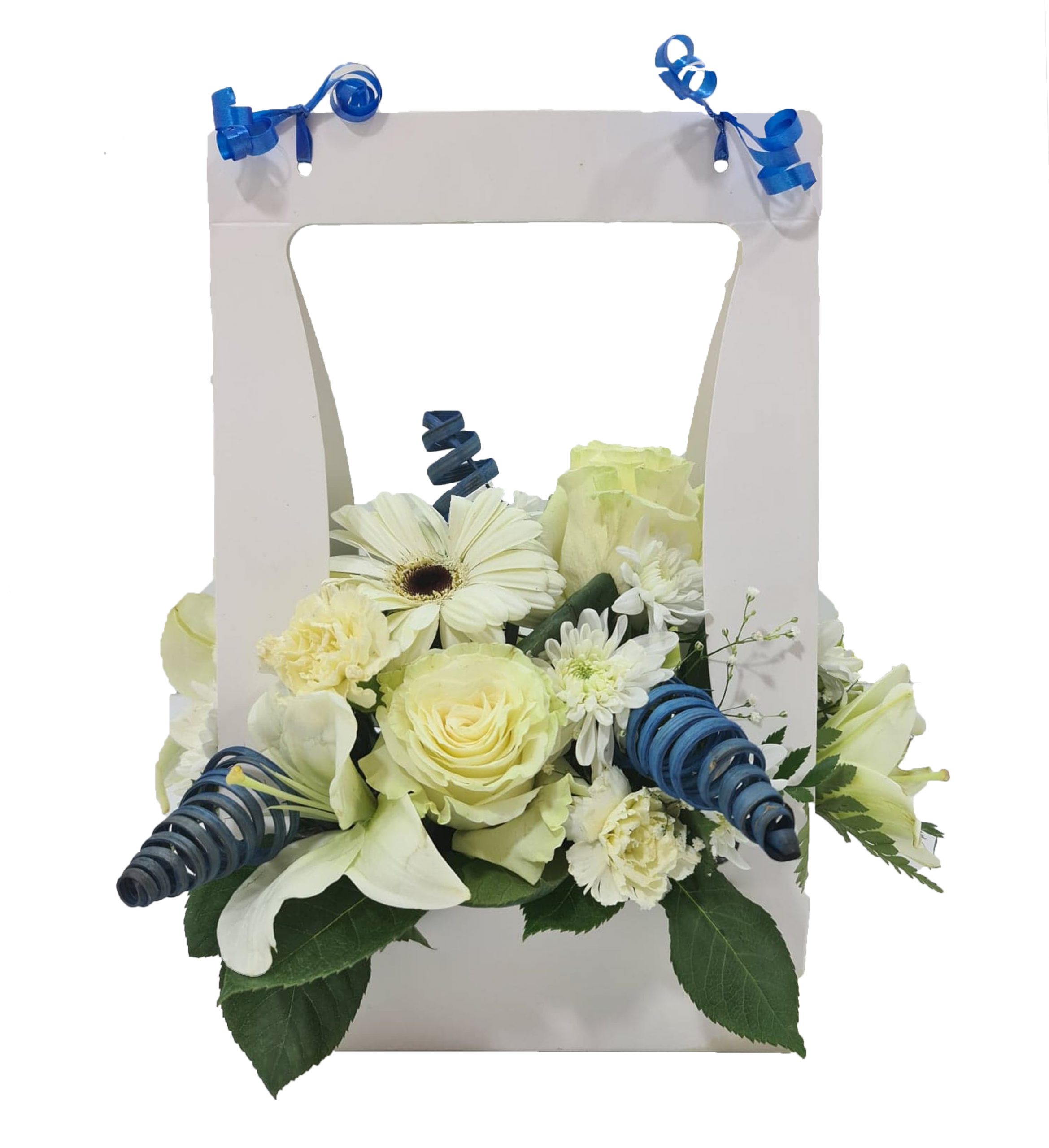 A stunning floral gift bag full of white roses, carnations, lilies and gerbera complemented with blue spiral cones. This arrangement is sure to brighten anyone’s day.