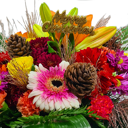Seasonal Mixed Bouquet, Merry Christmas Pick, Pine Cones Picks (x3), Blue Nun Gold and Mince Pies (x4) included
