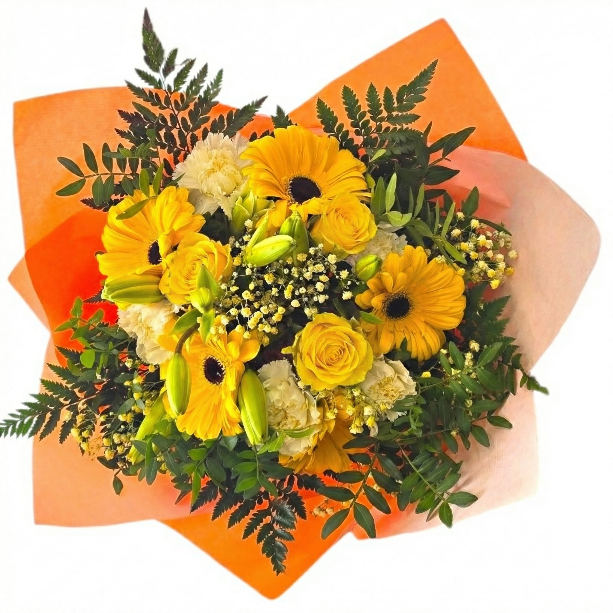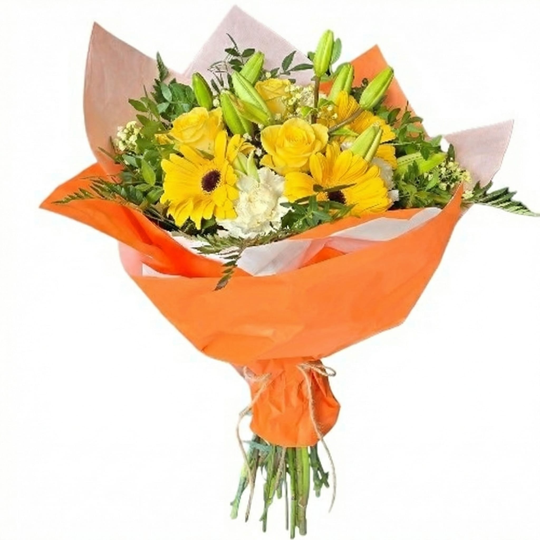 Brighten any space with this vibrant arrangement of yellow gerberas, roses, and lilies, accented by delicate white blossoms and lush greenery. Carefully hand-tied in warm orange wrapping for a cheerful, uplifting presentation—perfect for celebrations, congratulations, or simply spreading sunshine.