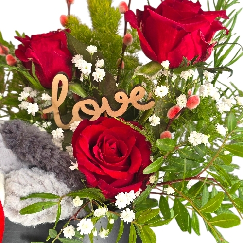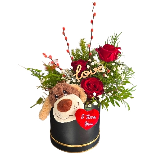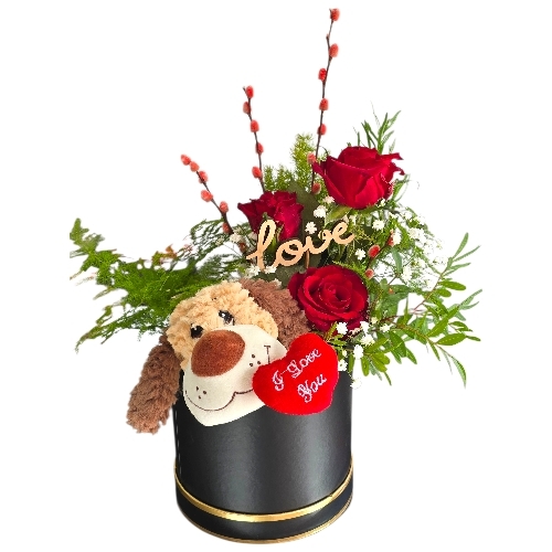 A charming flower arrangement in a sleek black hat-box with a gold rim. Red roses, delicate greenery, and small white gypsophilia create a romantic, lush display. A plush grey dog toy peeks out from the hat box.